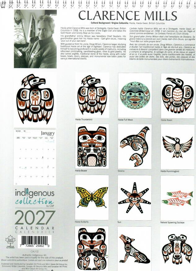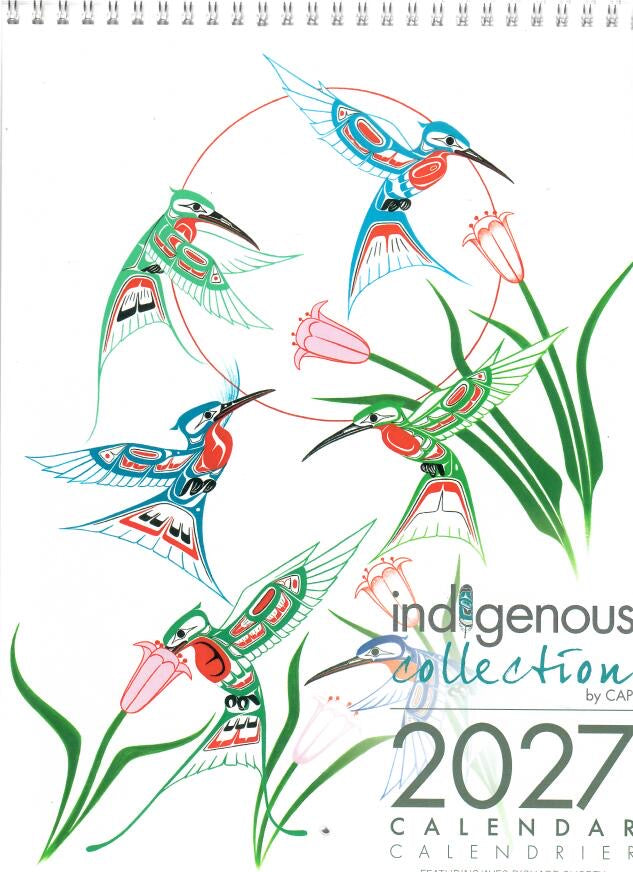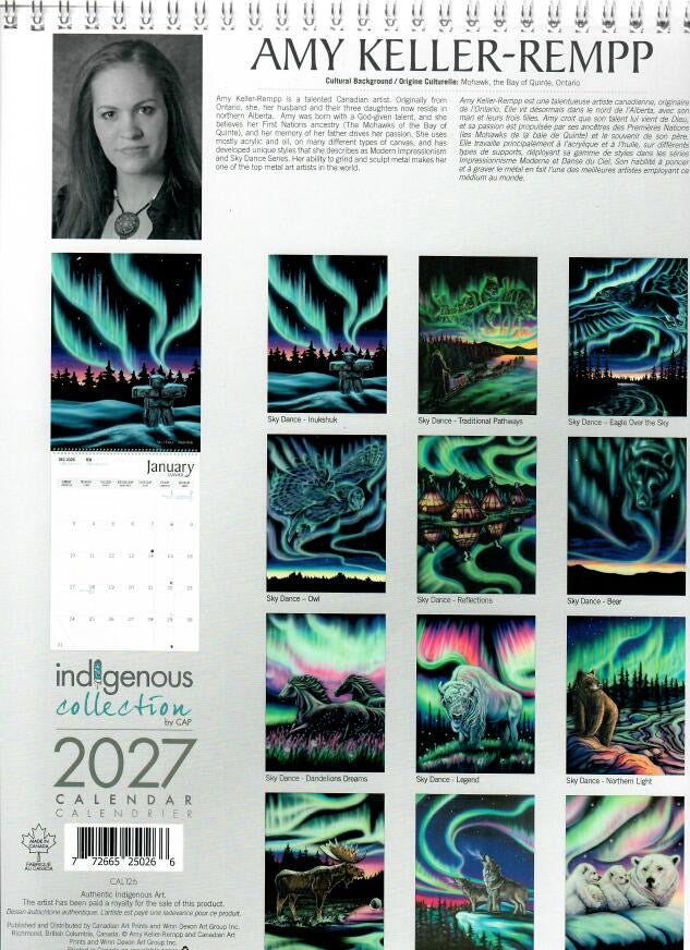 Each 12 month calendar is printed on FSC certified premium quality fine art paper, and is metallic coil bound and packaged in a protective sleeve. The artist's photo and biography are on the back of each calendar. The finished size is 12" x 9" when closed and 12" x 18" when opened. They are designed, printed, and proudly made in Canada.