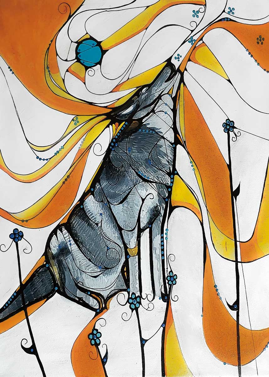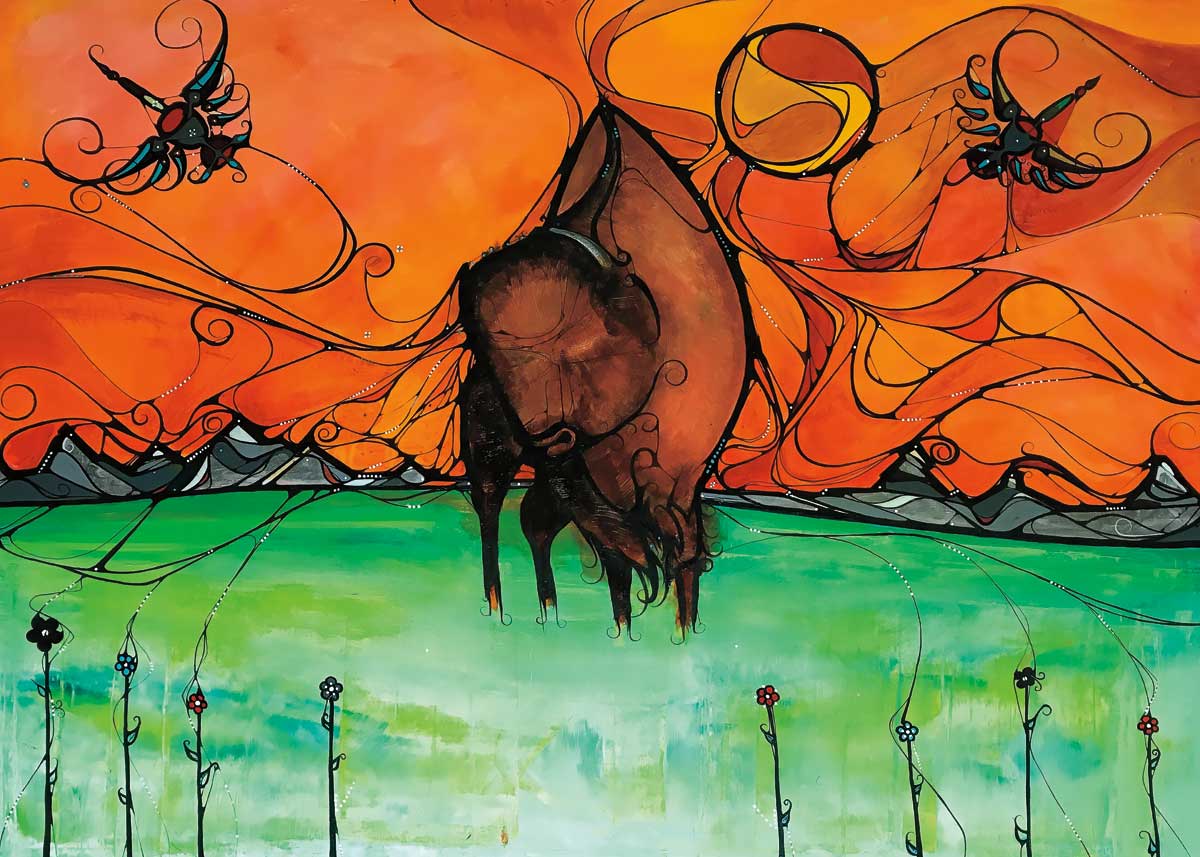 Laird Goulet’s unique and vibrant painting style reflects the spiritual and artistic imprints that have been inherently transferred to him by his grandmothers. Laird uses the power dot to best capture the floral beadwork patterns and rich birch bark biting imprints that his grandmothers had mastered before him.