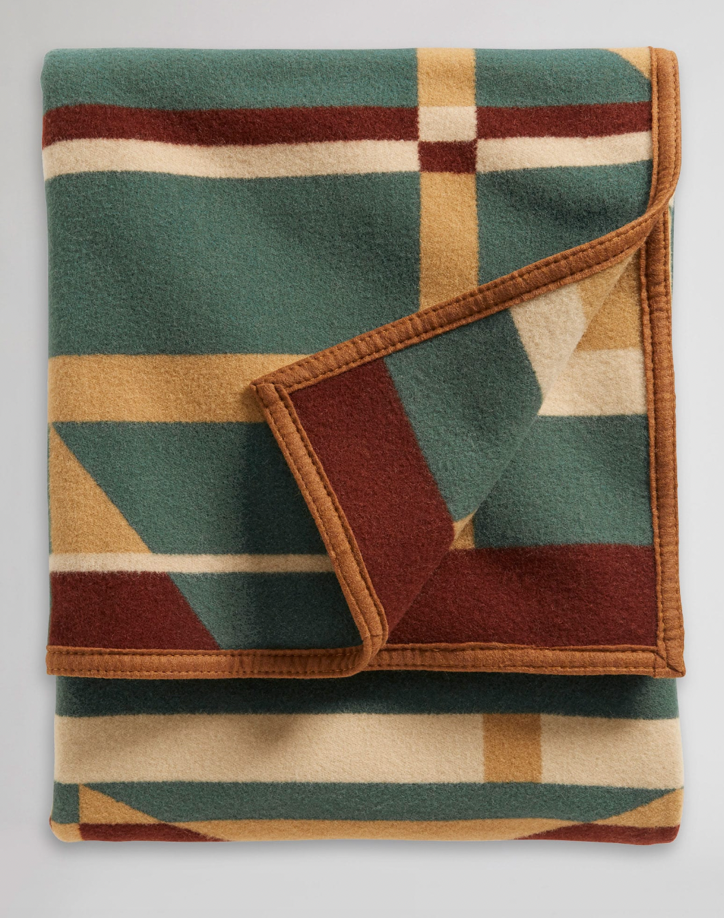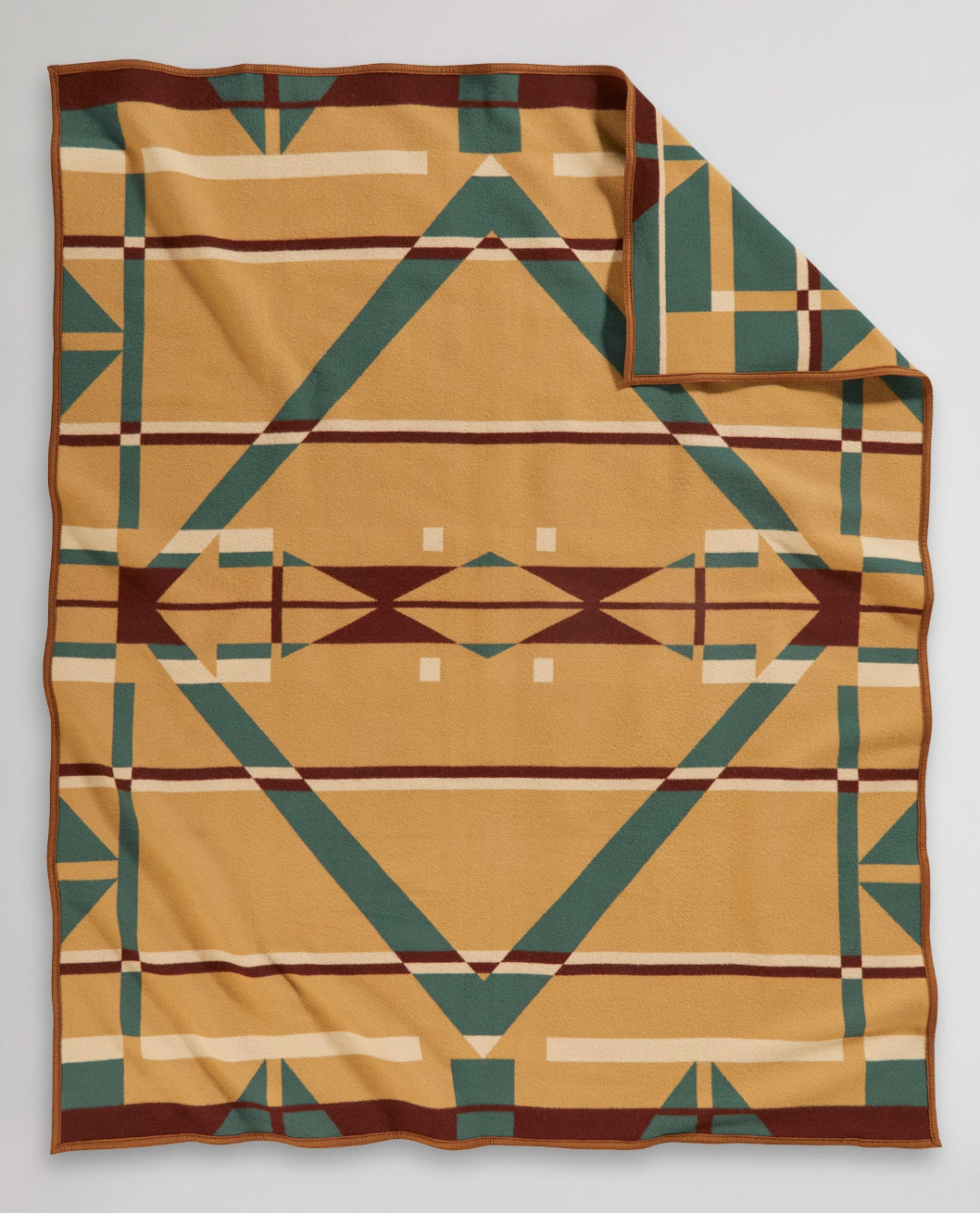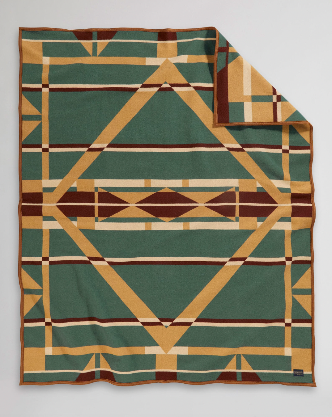Created by Native American artist Ramona Sakiestewa, this USA-made wool blanket pays homage to the strength and utility of the cedar tree, considered by many Nations to be sacred. Bark and berries from can be used for medicine and food, with wood used for building and carving. This pattern embraces the colours of the tree, with an enclosing, protective diamond at the centre.