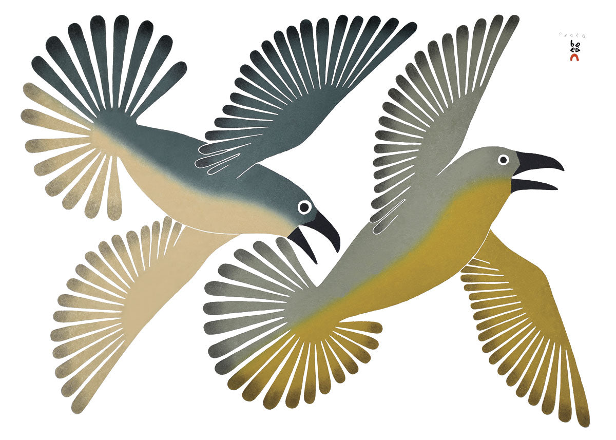 Kenojuak first began experimenting with drawing and stone carving in the late 1950s. Her early work appeared in the Cape Dorset Annual Graphics Collections, launching a career that would include numerous national and international commissions, special projects and exhibitions. Her life and art have been the subject of a film produced by the National Film Board of Canada, and a book entitled “Graphic Arts of the Inuit: Kenojuak”, published in 1981.