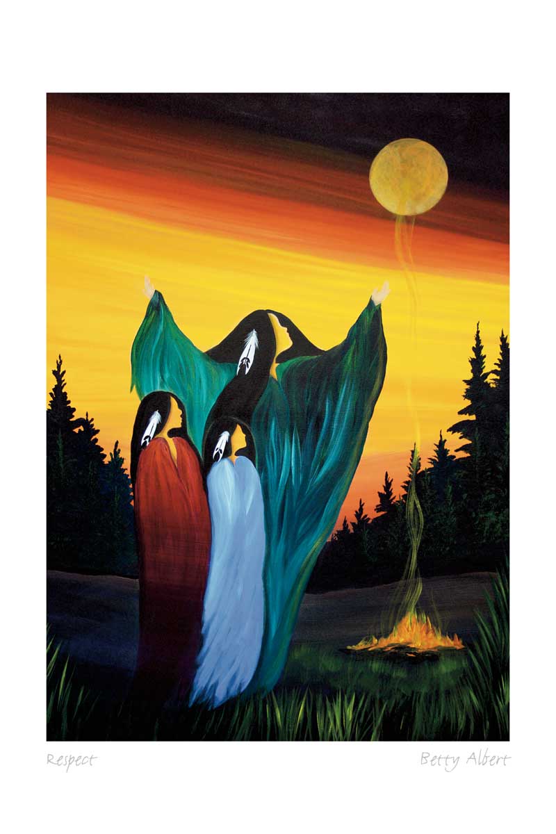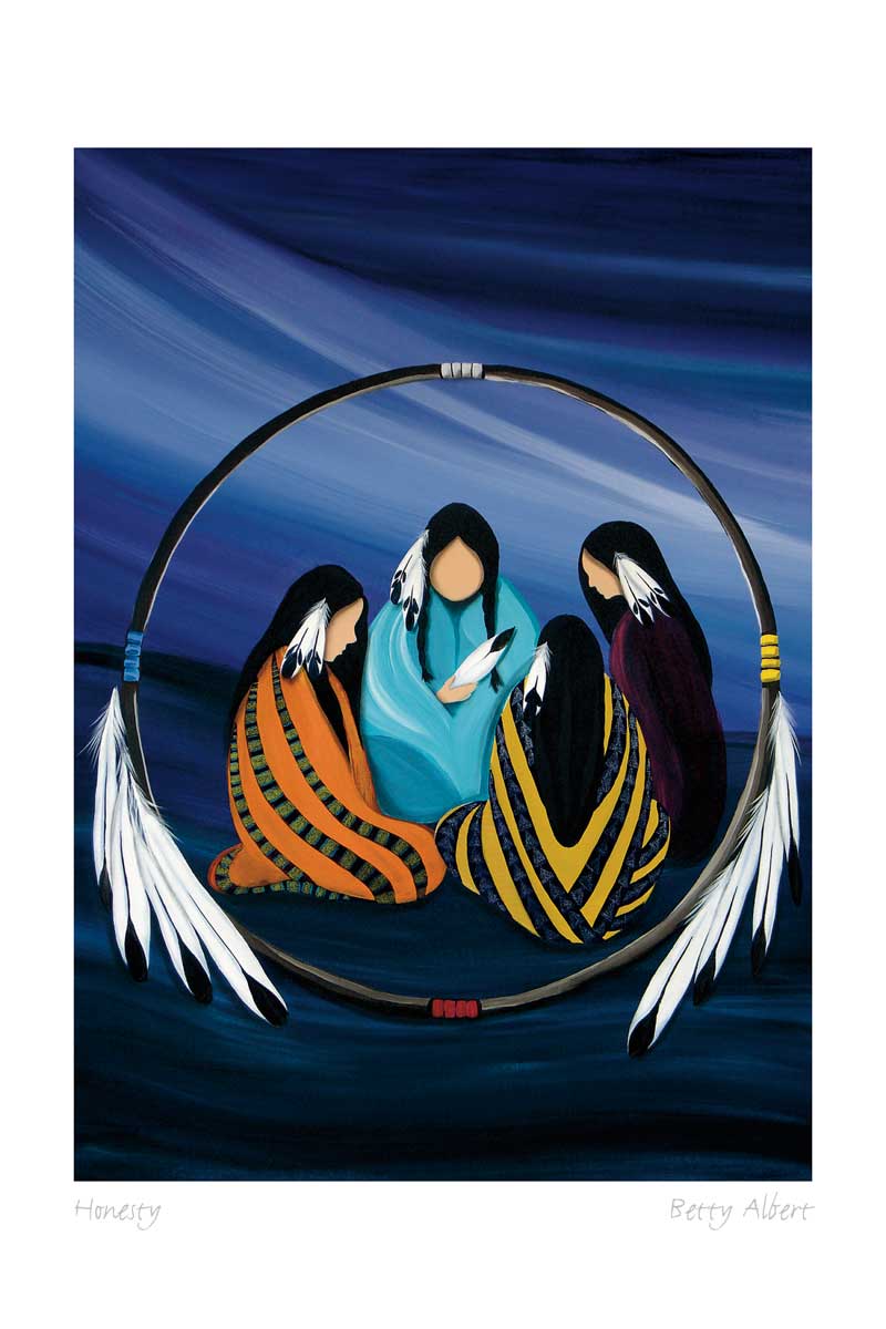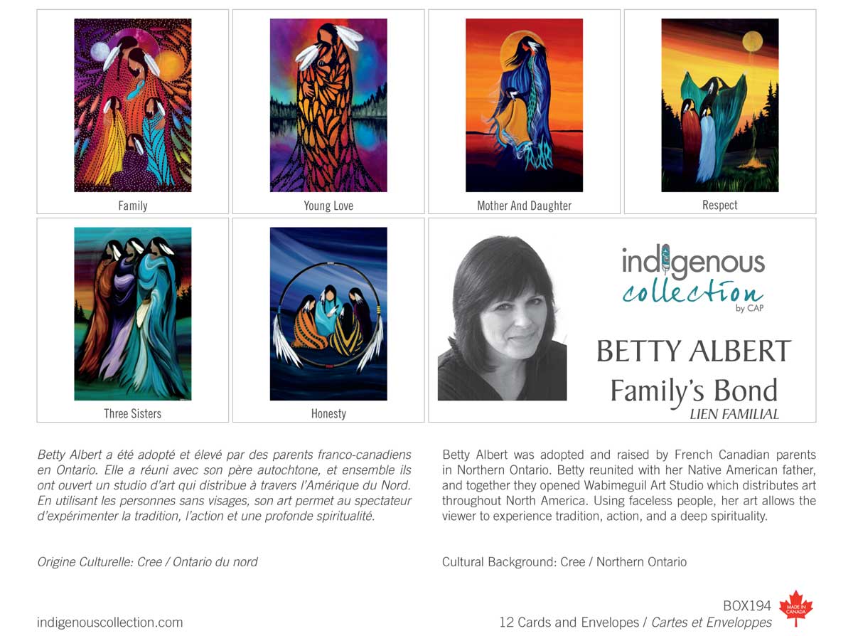 Betty Albert-Cree. Betty Albert was adopted and raised by French Canadian parents in Northern Ontario. She spent time on Vancouver Island where both of her interests in art and spirituality surfaced. During the next twenty years, she worked with pen and ink, and improved her artistic techniques. Circumstances eventually brought her back to her Native American father, discovering her birth right as a Cree. Like many Cree people, dreams are an important part of her life and her work. She discovered that her dream people were faceless and this is evident in some of her work. Her art allows the viewer to experience tradition, action, and a deep spirituality.