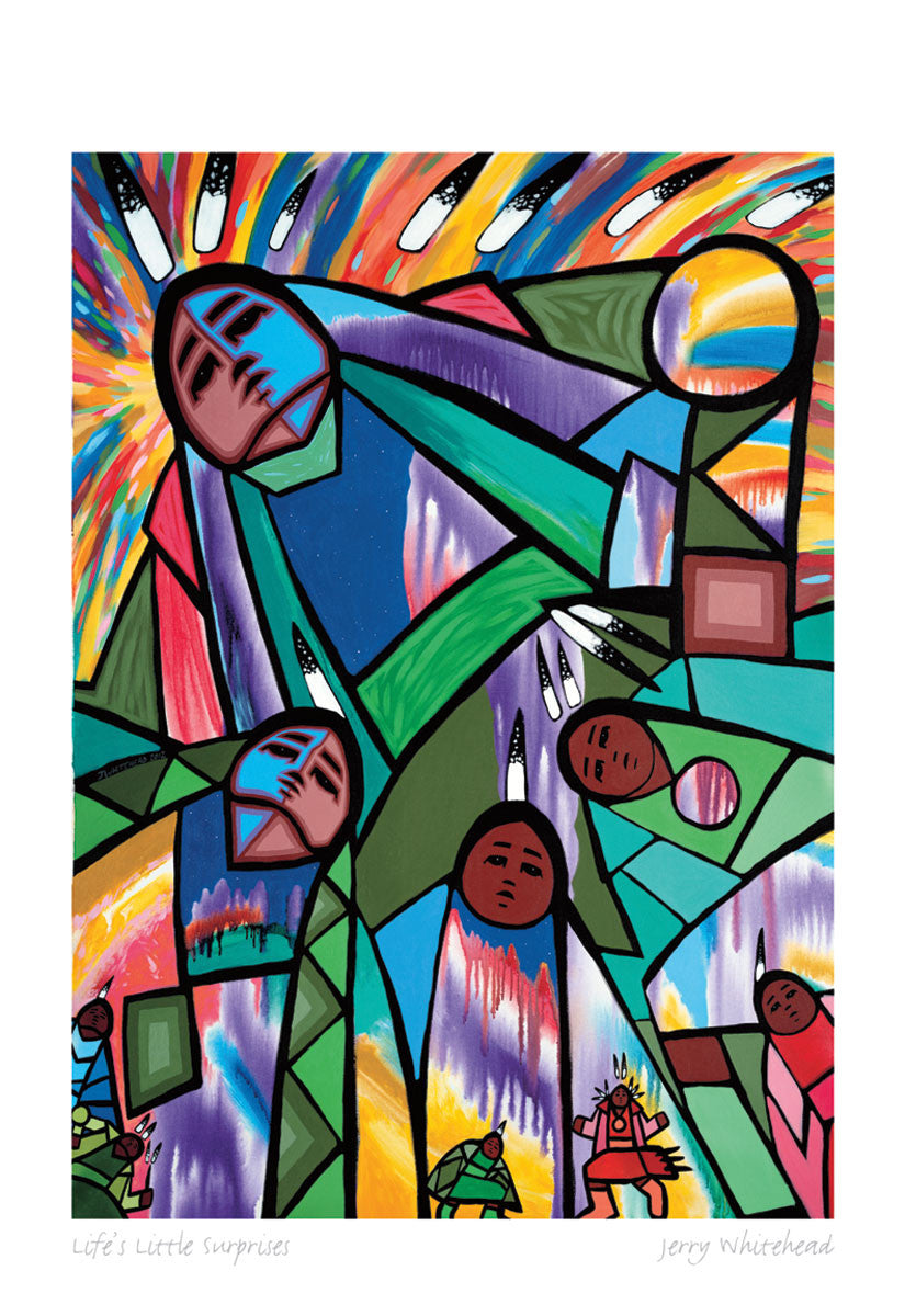 Cree artist Jerry Whitehead, born in 1957, is from the James Smith First Nation. Jerry received a Bachelor of Arts in Indian Art, S.I.F.C from the University of Regina in 1983. He also completed a Bachelor of Fine Arts from the Nova Scotia College of Arts and Design in Halifax in 1987.
