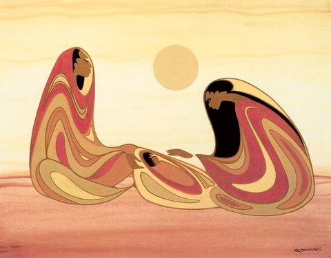 Maxine was born in Manitoba of Santee Oglala Sioux parents. She spent her early childhood on her mother’s reserve but at the age of six she left to attend an Indian residential school. Maxine’s early career as a legal secretary was soon overshadowed by her preoccupation with painting and drawing. She took a course in advanced design where a teacher noticed Maxine’s tendency toward linear expression and encouraged her in the use of shape and line to suggest movement. She learned those lessons well, as evidenced by much of her work today. Since those early days Maxine has mastered the skills of painting and drawing plus the processes of serigraphy, etching and stone lithography. Recently she has turned her talents to the creation of editions in cast paper and limited edition bronze castings. Maxine has received excellent response to her work and is now able to devote herself full-time to the creation of art.Maxine Noel signs her artwork with her Sioux name IOYAN MANI, which translates as “Walk Beyond”. Visit our Main Gallery to view more of her works.