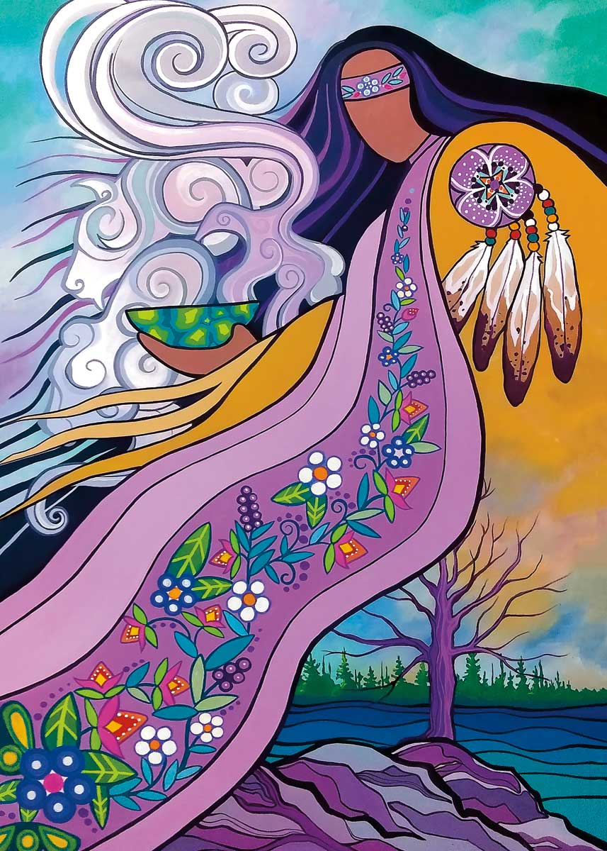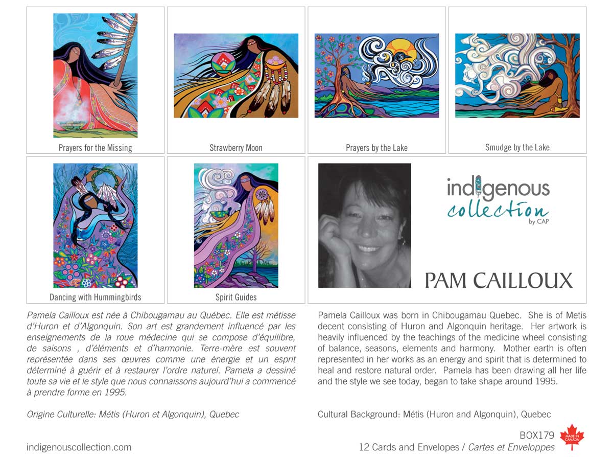 Pamela Cailloux was born in Chibougamau Québec. She is of Métis decent consisting of Huron and Algonquin heritage. Her artwork is heavily influenced by the teachings of the medicine wheel consisting of balance, seasons, elements and harmony. Mother earth is often represented in her works as an energy and spirit that is determined to heal and restore natural order. Pamela has been drawing all her life and the style we see today, began to take shape around 1995.