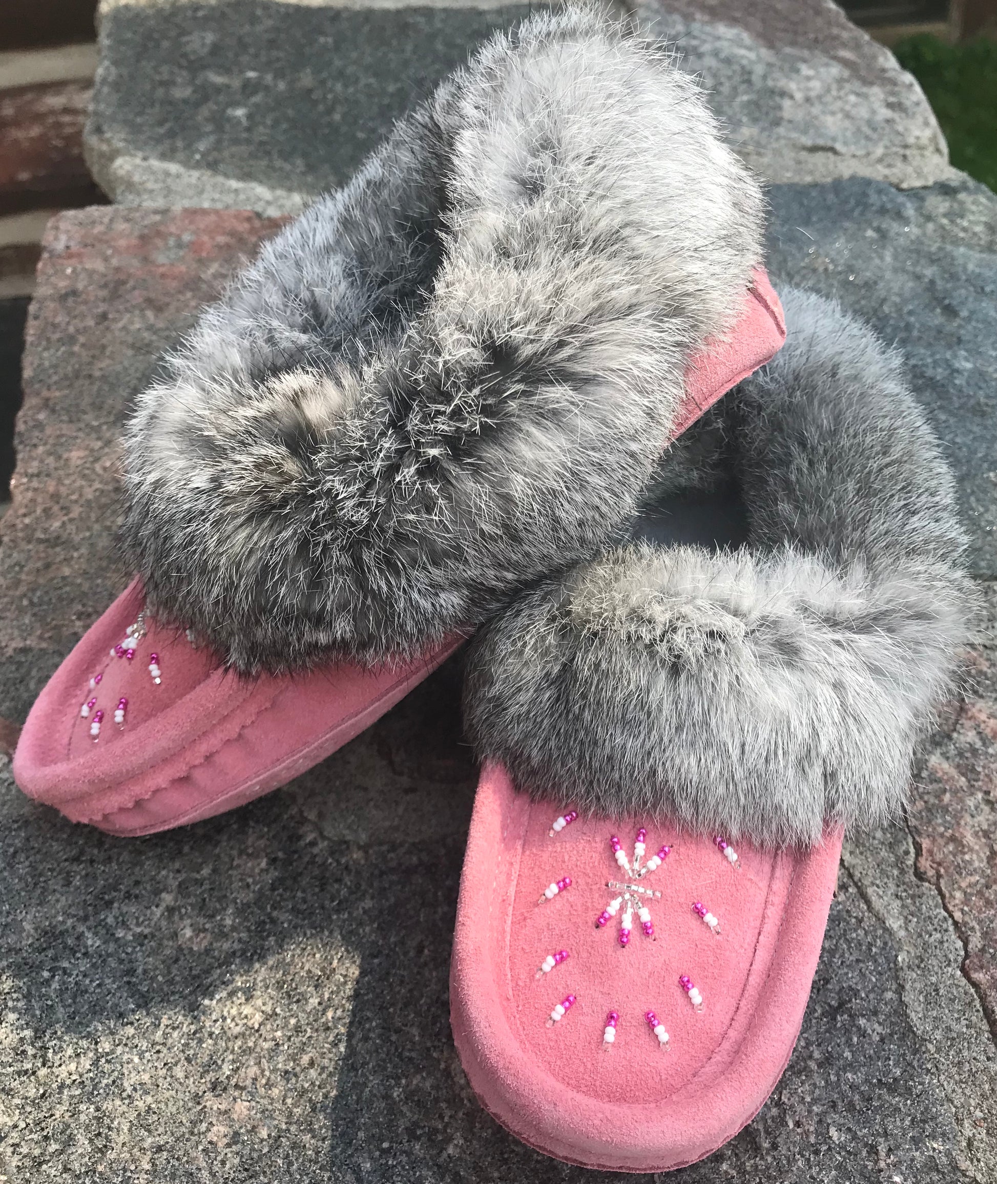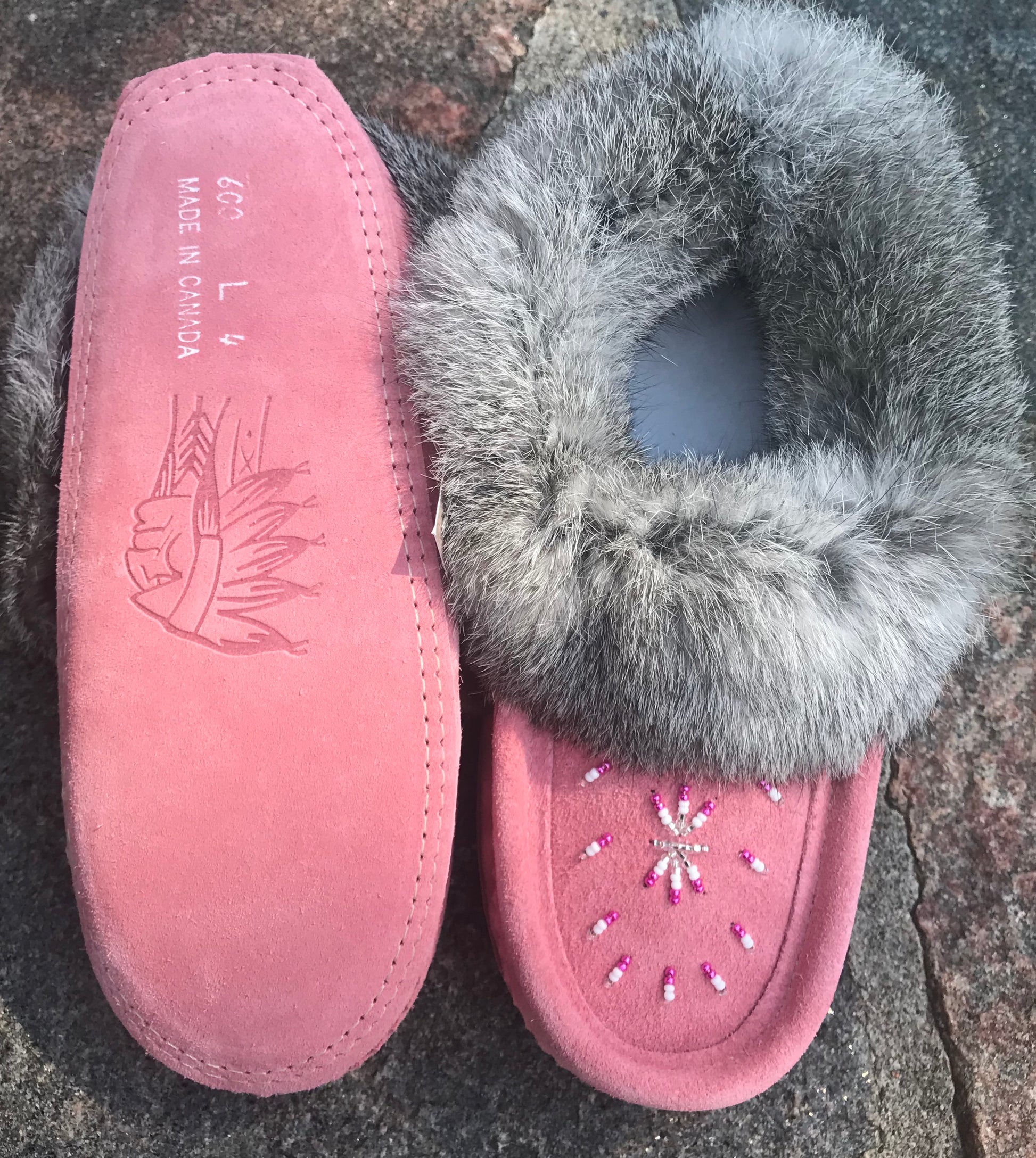 This iconic style has been worn by generations. Rabbit fur, beads, suede with fleece lining. Suitable for indoor wear year round. Available in 15 colours and ladies sizes 4-11. Full Sizes only, half sizes round down to next full size. Made in Canada. Inquire about this item