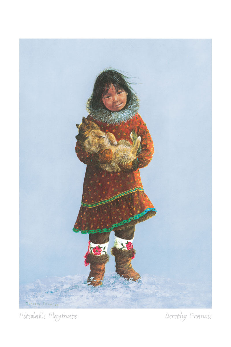 Dorothy Francis was born and raised in Saskatchewan , Canada. A childhood passion for drawing and painting developed into a full time career as an artist, whose work is now in demand throughout the world. She is best known for her portraits of Inuit People, whom she has studied extensively, to ensure that details in dress and artifacts are correct. Her compositions radiate a light-hearted happiness and often feature children.