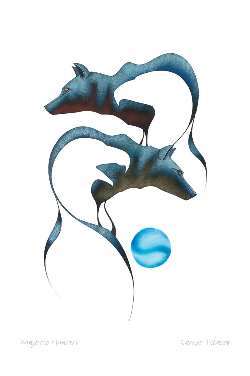 Garnet, a prolific talent, has been painting for over twenty years and occasionally sculpts in soapstone and wood. He apprenticed under Isaac Bignell, a prominent artist who has passed away. Bignell’s style and form greatly influenced Garnet who is preserving it to this day. Fluid lines, soft earthy tones against simple stylized backgrounds are all characteristics that have attracted many collectors. Garnet has works in private collections throughout Germany, Austria, Switzerland, Australia, U.S.A and Canada. His work has also been displayed at the Art Expo in Calgary.