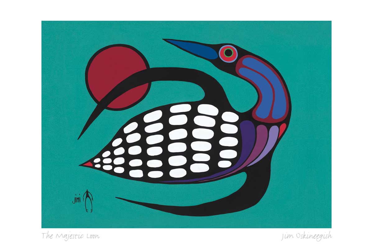 Jim Oskineegish is an Ojibwe artist who is a registered member of the Eabametoong First Nation which is located in northwestern Ontario, Canada. Jim paints in the Shamanistic Woodland Style using bold lines and bright colors. He loves to paint legends and stories of his people and hopes that his art can bridge a universal understanding of love, faith, and unity. “I want to promote positive Ahnisnabae culture to the world.”