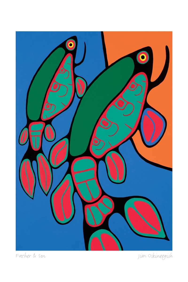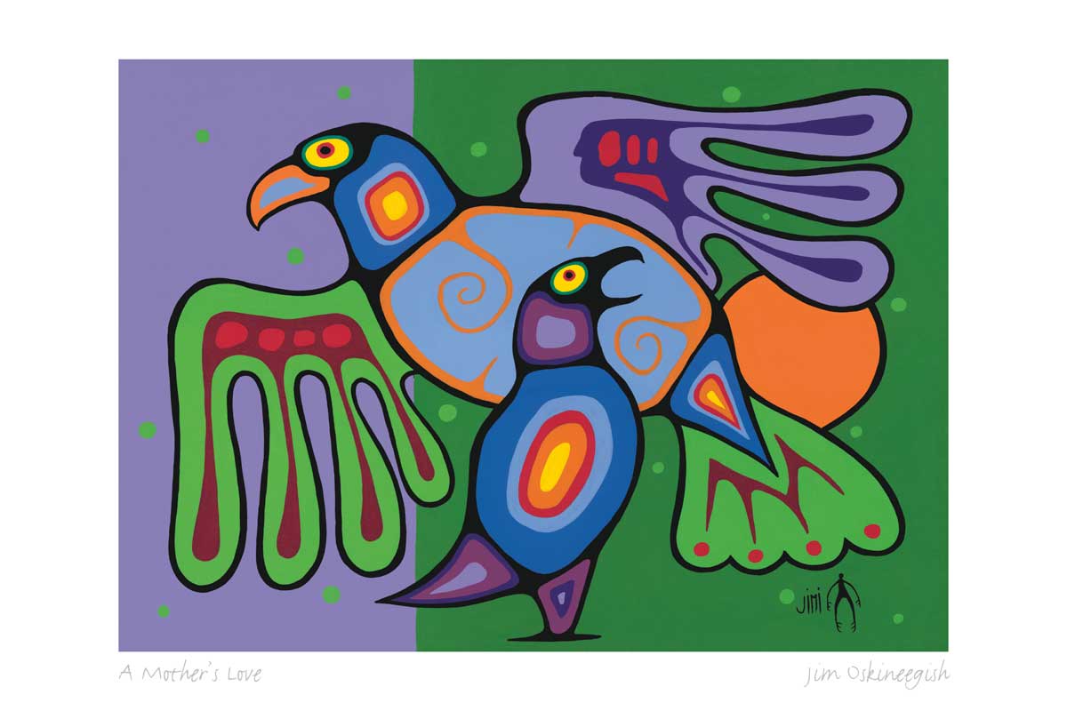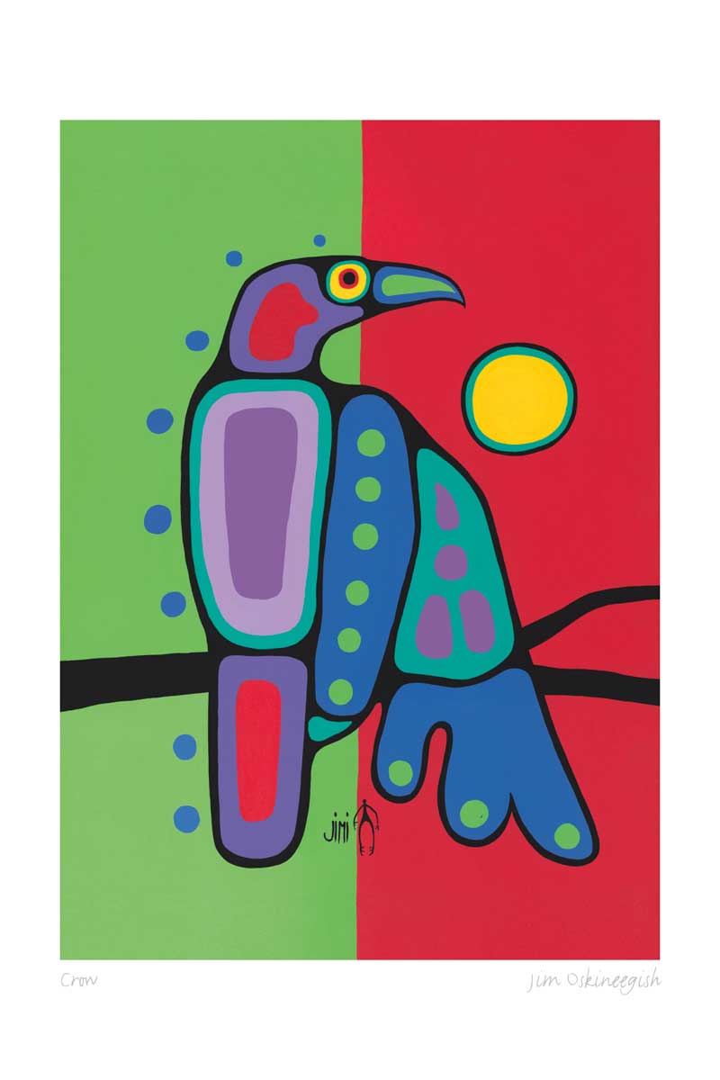 Featuring the artwork of Jim Oskineegish who is an Ojibwe artist who is a registered member of the Eabametoong First Nation which is located in northwestern Ontario, Canada. Jim paints in the Shamanistic Woodland Style using bold lines and bright colors. He loves to paint legends and stories of his people and hopes that his art can bridge a universal understanding of love, faith, and unity. “I want to promote positive Ahnisnabae culture to the world.”