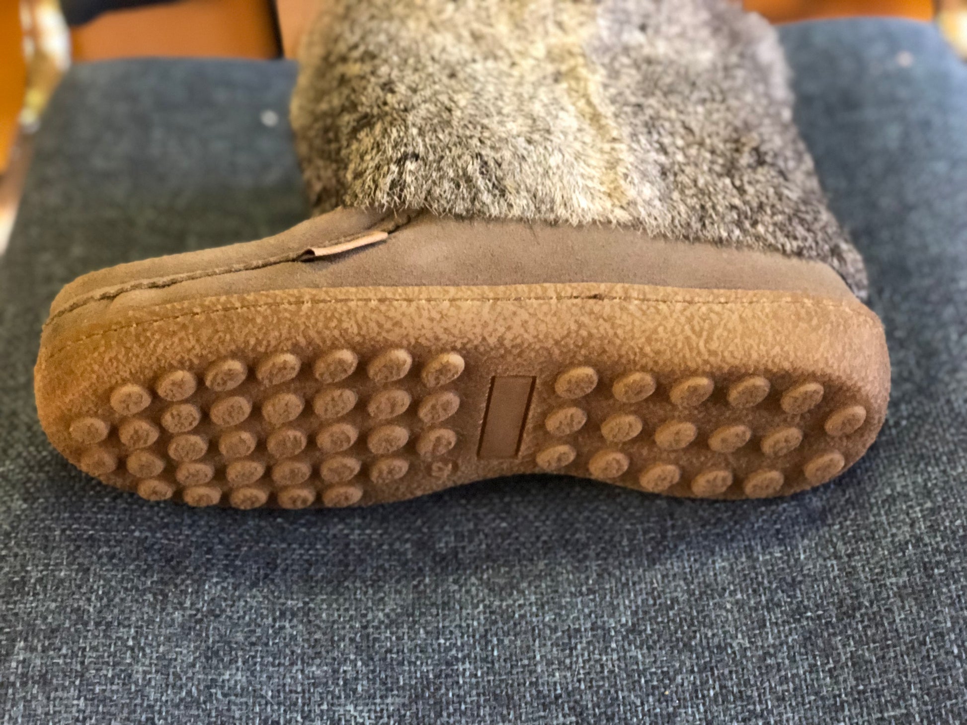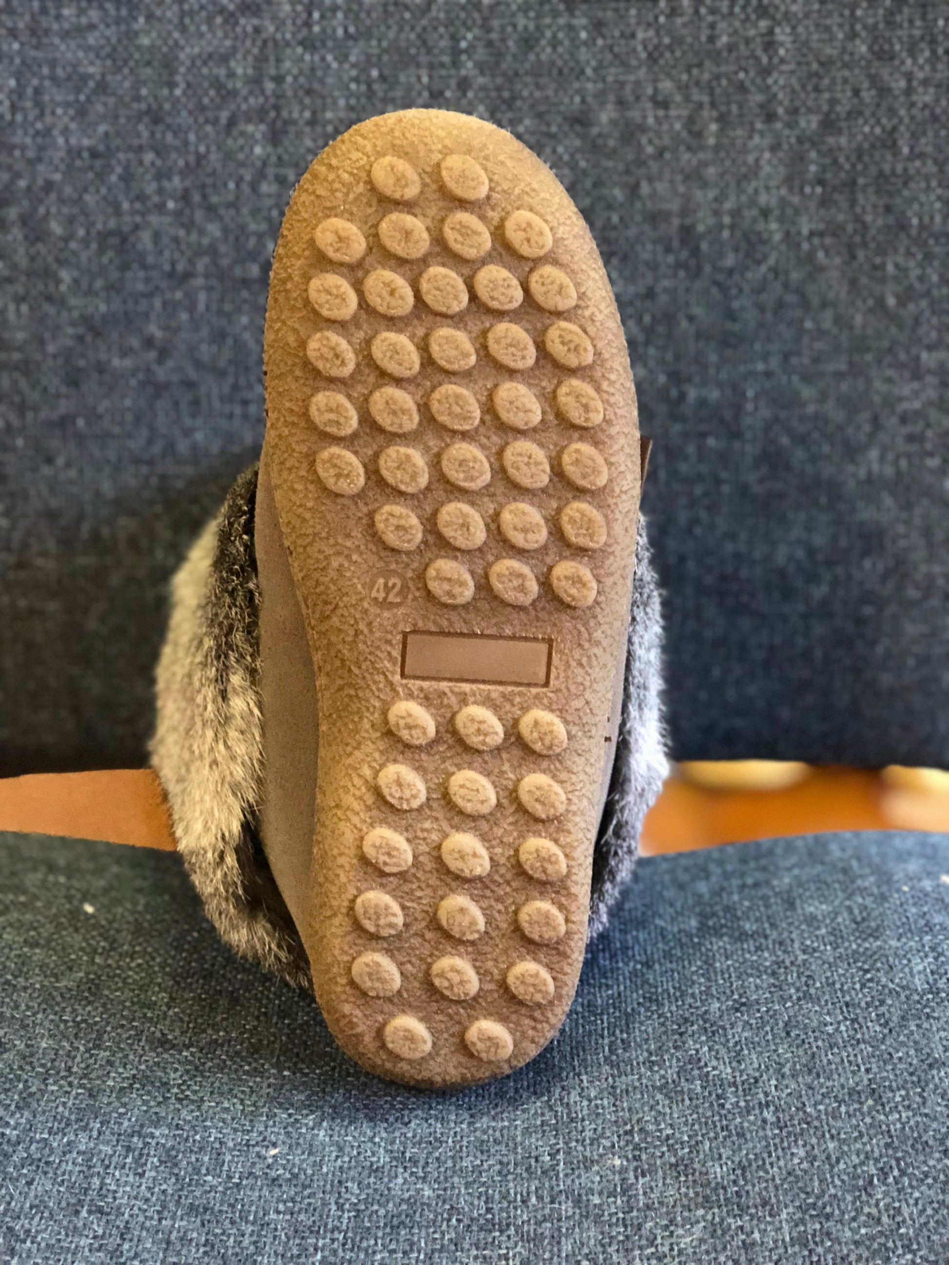 Made from suede, rabbit fur, glass beads, fleece lining, rubber sole