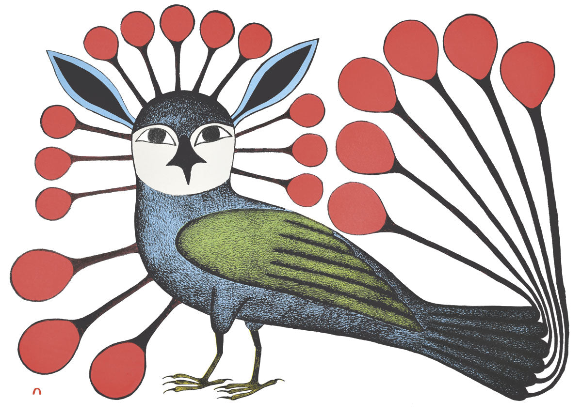 Kenojuak first began experimenting with drawing and stone carving in the late 1950s. Her early work appeared in the Cape Dorset Annual Graphics Collections, launching a career that would include numerous national and international commissions, special projects and exhibitions. Her life and art have been the subject of a film produced by the National Film Board of Canada, and a book entitled “Graphic Arts of the Inuit: Kenojuak”, published in 1981.